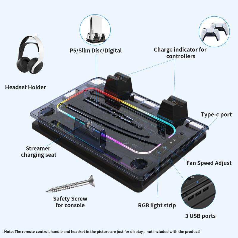 - Cooling Fan: Keeps your console and accessories cool.